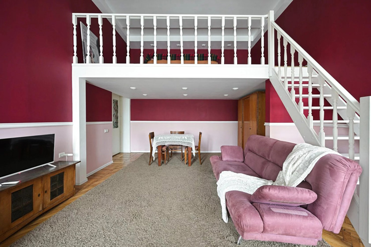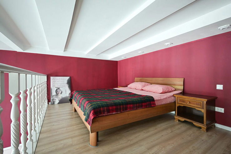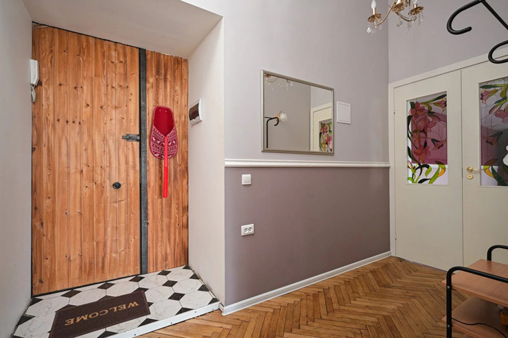 - Мебель: вешалка, диван раскладной, зеркало, кровать двуспальная, прикроватные тумбочки, стол, стулья, шкаф